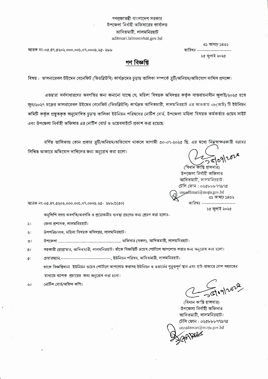 | ২ | ২০২৫-২০২৬ চক্রে ভিউব্লিউবি কর্মসূচির জন্য উপকারভোগী মহিলা নির্বাচনের চুড়ান্ত তালিকা | ১৬-০৭-২০২৫ | দেখুন | ||